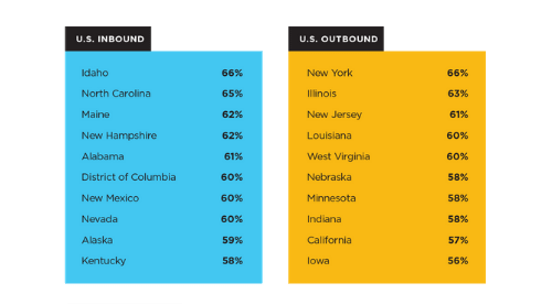 The 10 U.S. states with the highest percentage of outbound and inbound moves are listed in order below, with Idaho ranking as the study’s inbound leader for the fourth time since 2016. New York led the country in outbound moves in 2020, a designation it has held for two years in a row. This year, the state experienced its highest percentage of outbound moves since the study’s inception.