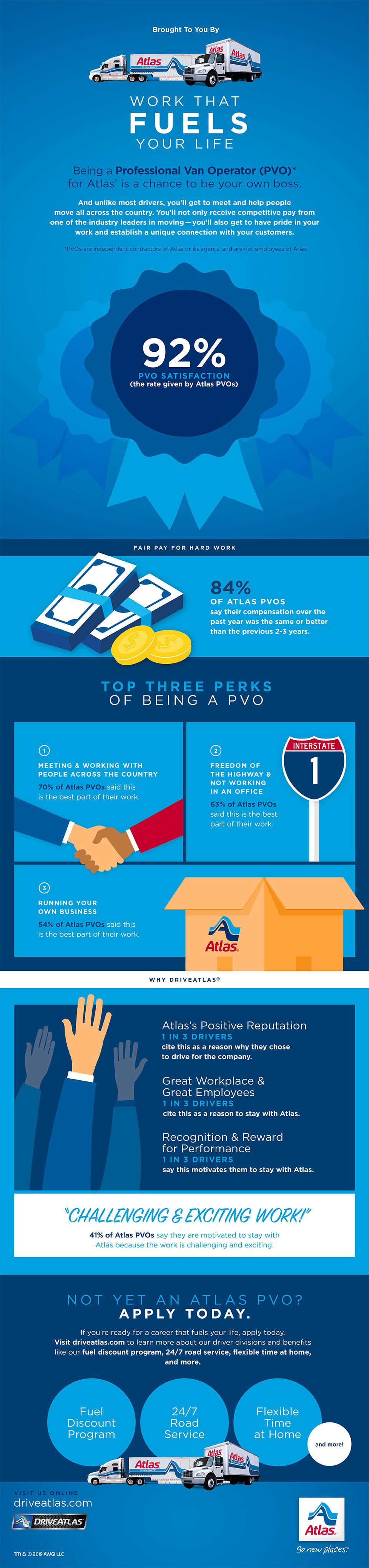 Finally, 41% of PVOs find the work challenging and exciting, and Atlas encourages potential PVOs with incentives like a fuel discount program, 24/7 road service, and flexible home time. Becoming a PVO with Atlas is rewarding for those who love independence, travel, and meeting new people.